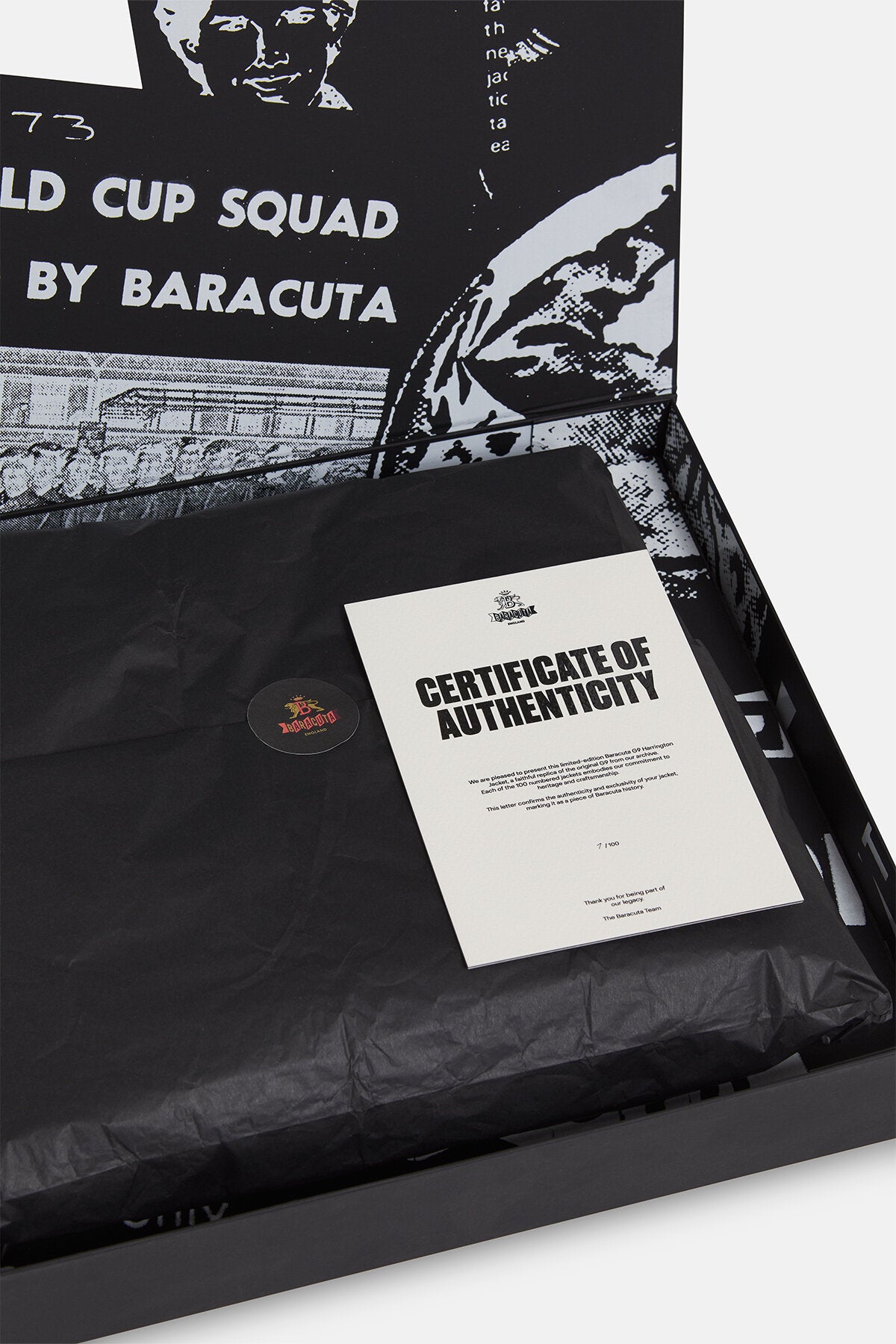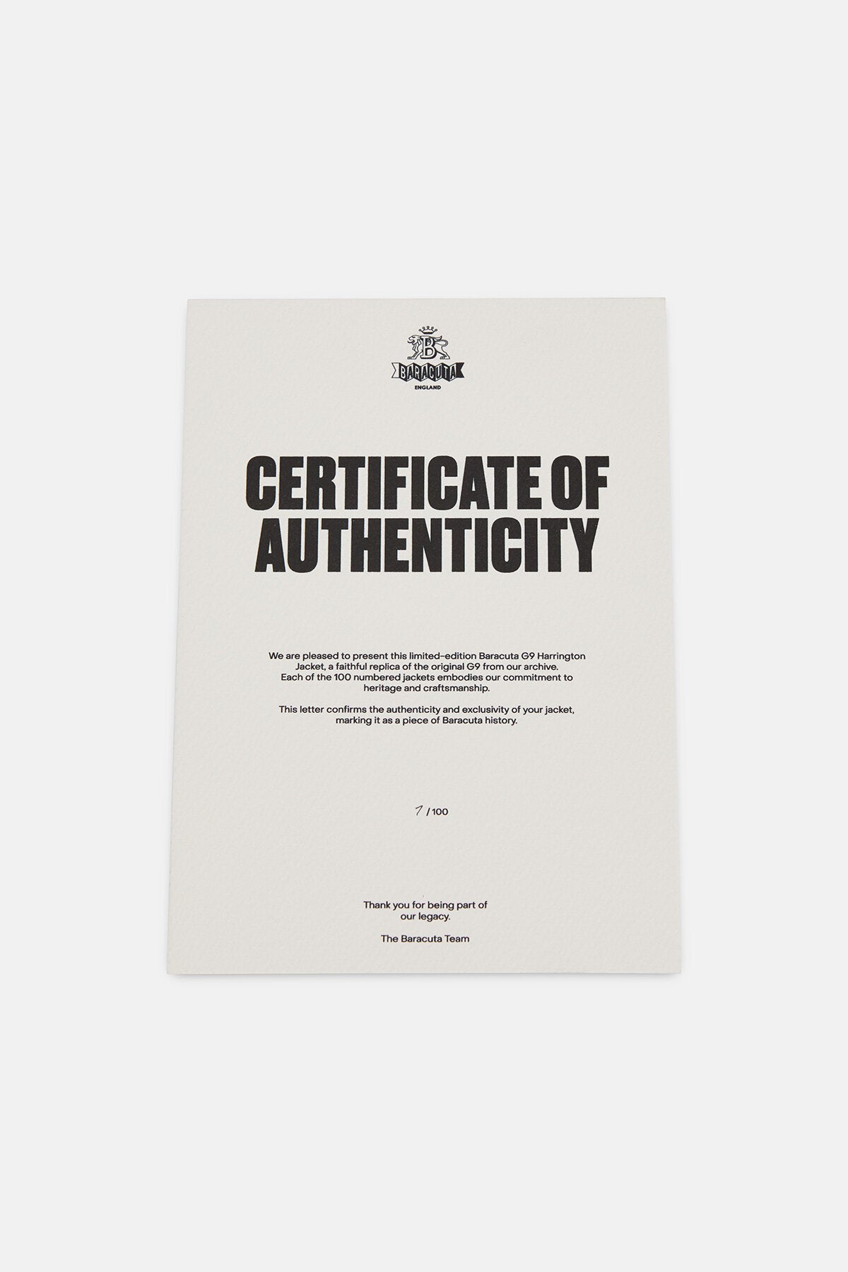 Each of the 100 numbered jackets embodies our commitment to heritage and craftsmanship, marking it as a piece of Baracuta history. Made in the UK.