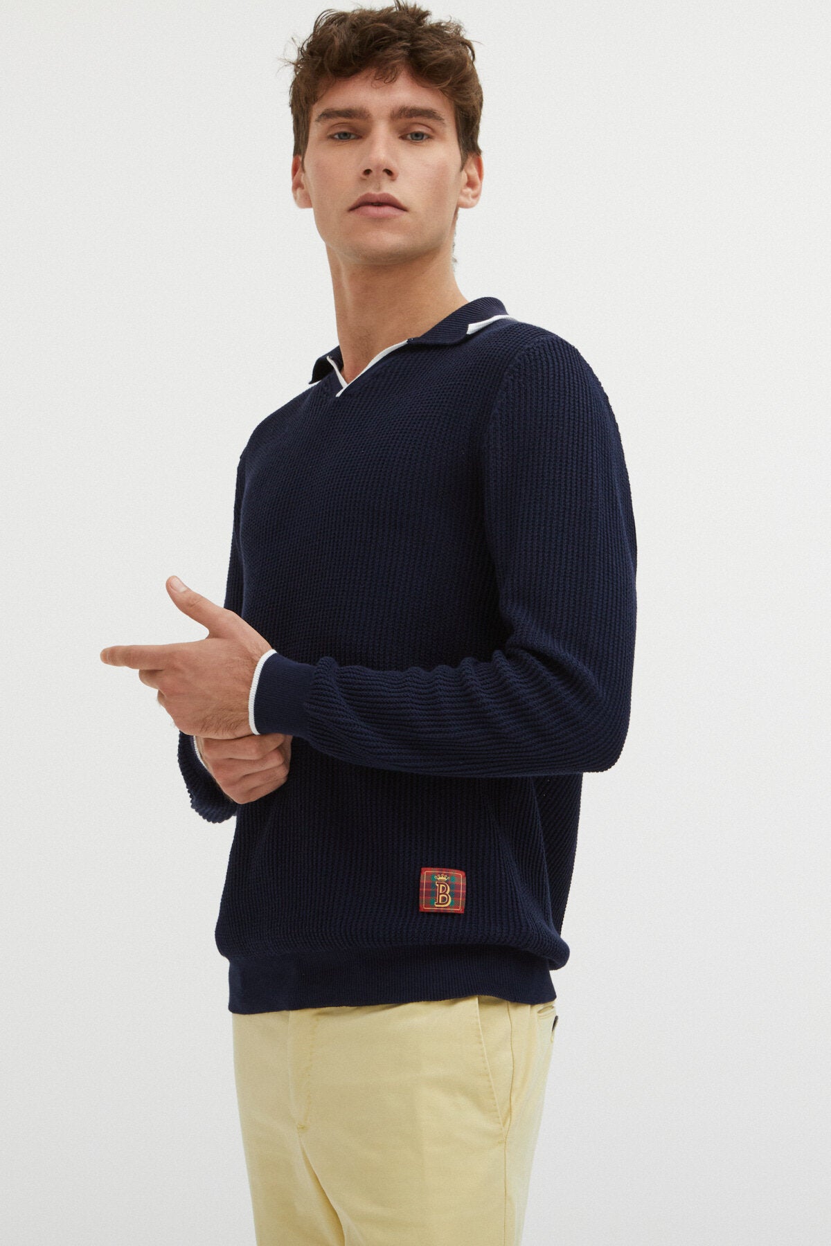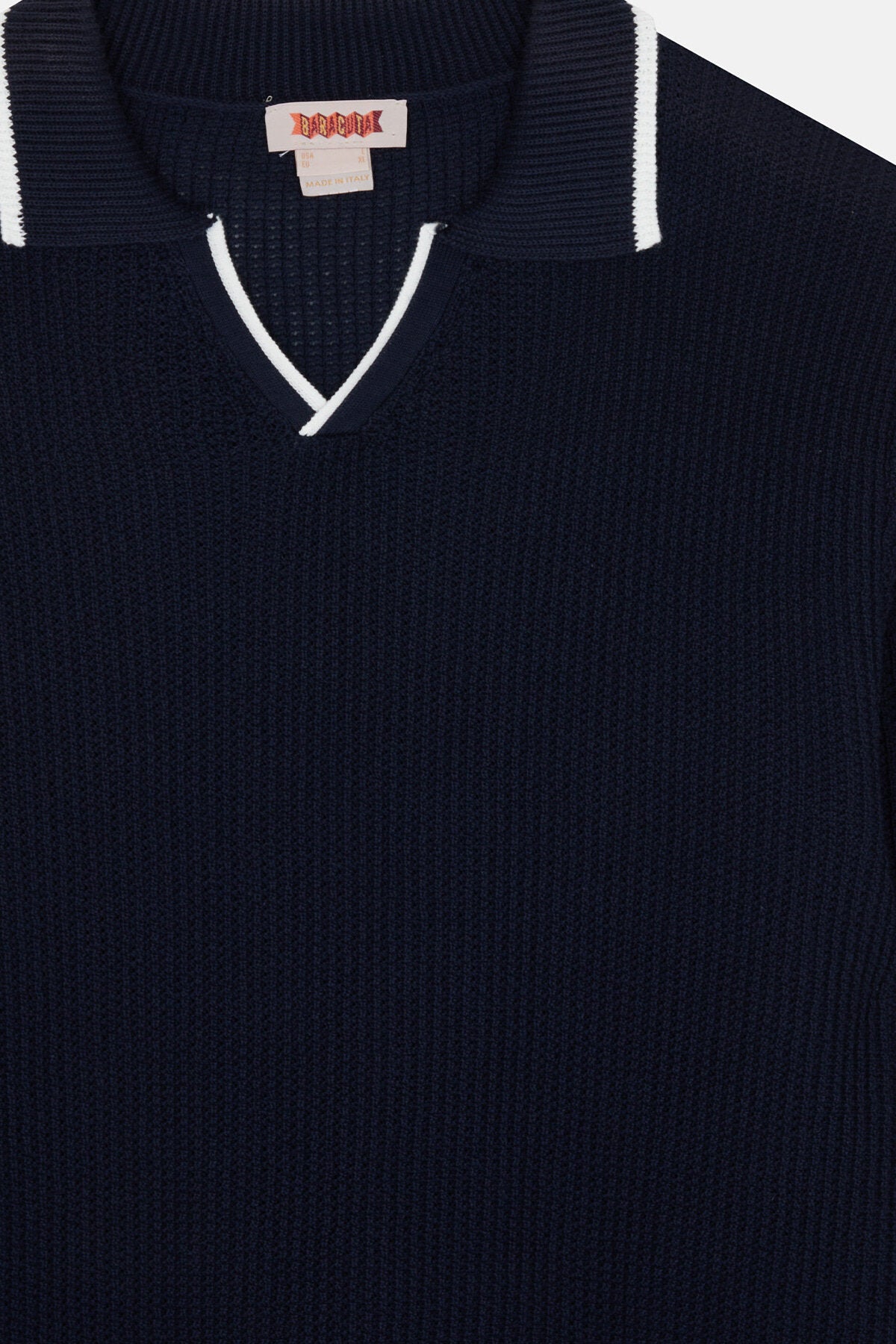 • If you have something special coming up boy have we the perfect polo for you. This long-sleeved V-neck Mesh Polo is made from 100% cotton waffle mesh allowing for breathability when the weather gets a little too warm. Embellished with the Baracuta logo above the waistline, you have the choice of keeping it or removing it. Whether it's warm or cold out, this long-sleeved polo can be worn as a light jumper or as an extra layer under your G9 Harrington! Made in Italy.