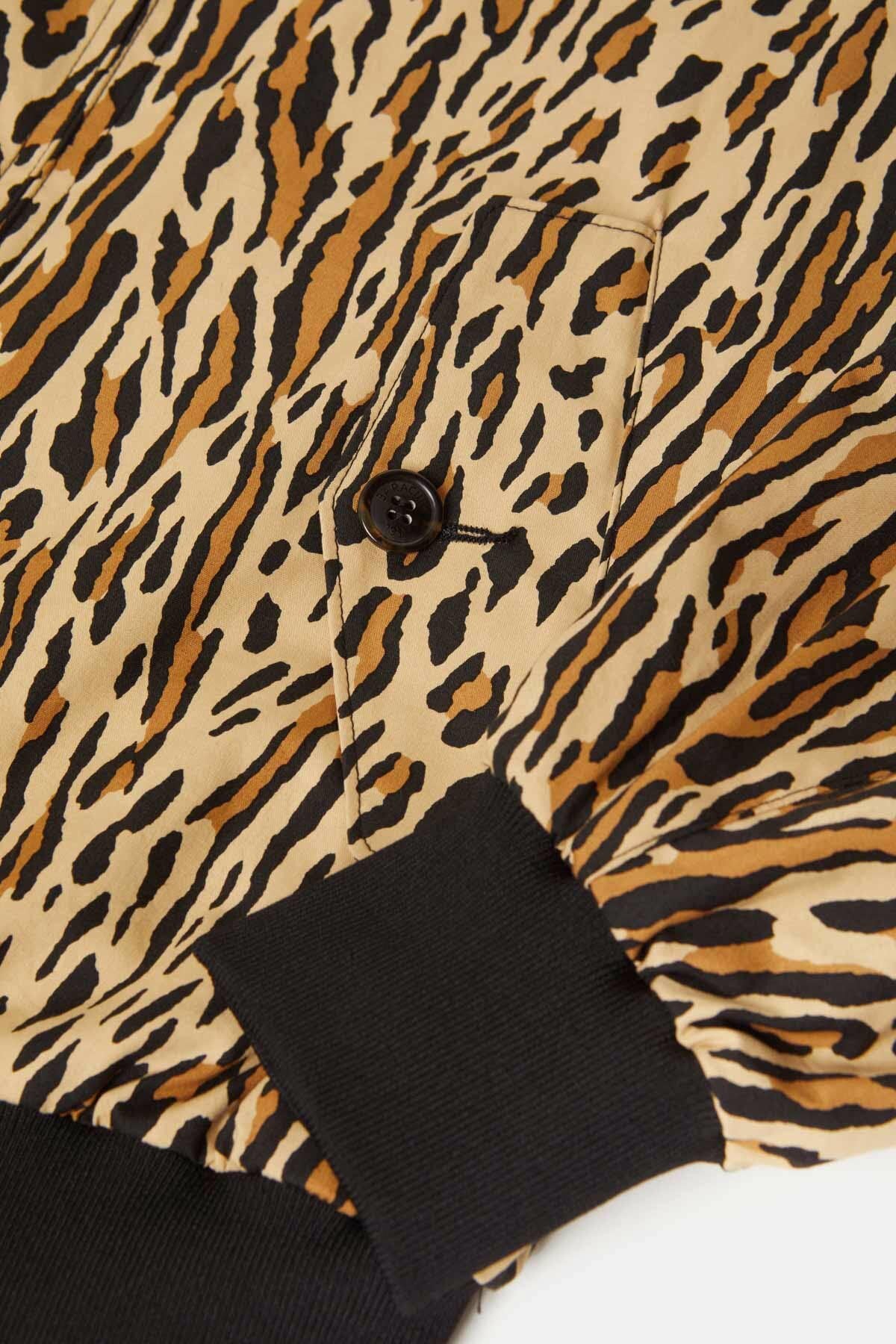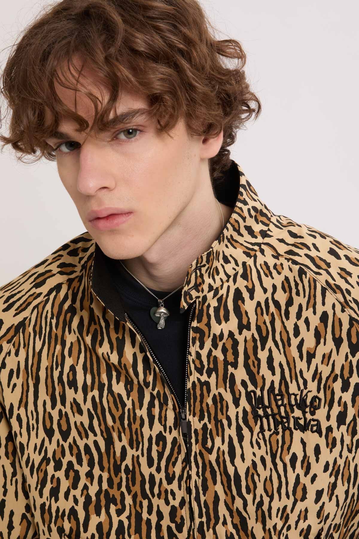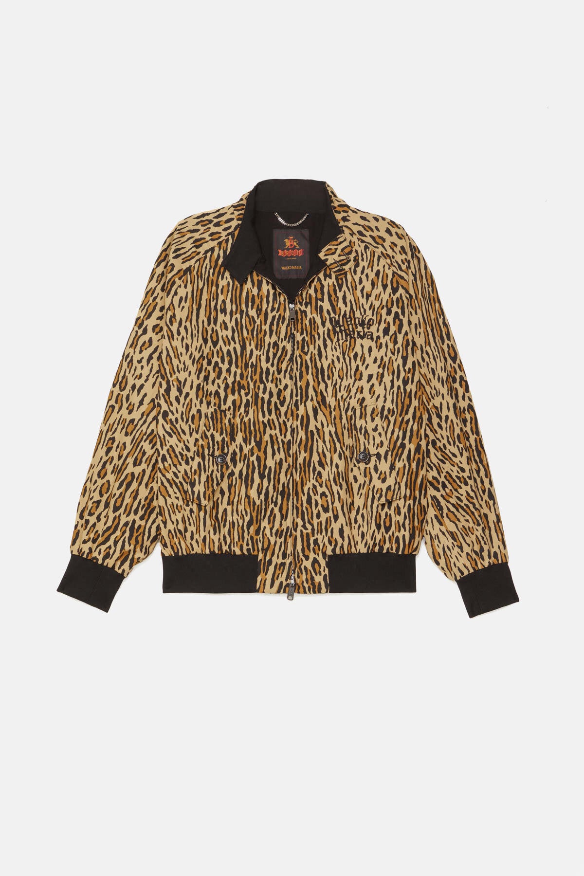 The jacket maintains the signature G9 construction, including the umbrella back yoke, raglan sleeves and ribbed Dog Ear collar with double-button closure. The collaboration is marked by “Wacko Maria” embroidered on the chest, a metal hanging chain and an internal pocket. For this edition, the jacket is finished with a leopard pattern exterior, a print long associated with Wacko Maria.